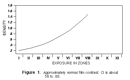 Contrast is the slope of the films characteristic curve and not the range of tones placed on it. A slope having a C.I. between about 0.56 and 0.60 is what most of us consider normal film contrast. See Figure 1. A steeper slope means a high-contrast negative, and a flatter curve means a low-contrast negative.