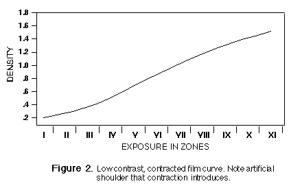 A contraction negative is developed to a lower C.I. than 0.56 to 0.60 (normal). It has a flattened curve and, by definition, has low contrast. See Figure 2. That this flattened curve may have received light from exposure Zones I through XII, or any other range of subject tones, is irrelevant. It has received reduced development and is therefore a low-contrast negative. Remember, contrast has nothing whatsoever to do with how many Zones of tone your subject contains. Contrast is strictly a function of how long and by what method you develop a negativeany negative. Contrast and subject tonal range are not related.