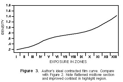 Many people shy away when someone brings up the tone reproduction cycle. It seems that many photographers feel comfortable dealing with film or paper curves individually, but grit their teeth when dealing with film and paper curves together. The interaction between film and paper curves causes a normal negative made from a normal subject range to print on a normal paper with increased midtone contrast. See Todd & Zakias book, Photographic Sensitometry (2nd Ed., Morgan & Morgan, 1981, pp. 90-94, The Tone Reproduction Cycle). Understanding this effect, it becomes obvious that to produce an excellent contraction negative, our best hope lies with minimizing the contrast loss in shadows and highlights and maximizing it in the midtones, the only part of the characteristic curve where there is contrast to spare. Rather than produce a contraction negative with a characteristic curve like that in Figure 2, we would much more ideally produce a curve like that in Figure 3. Such a curve makes the greatest contrast sacrifice in the midtones where we can most afford it. It was with this in mind that I began my experiments.