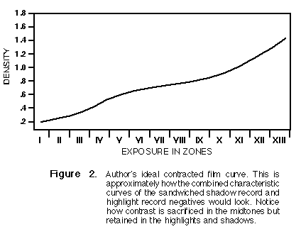 When the partially-redeveloped, duplicate shadow record negative is sandwiched with the normal contrast original highlight record negative, the characteristic curve they produce together is much like the one in Figure 2. The contrast loss is limited almost exclusively to the midtones.